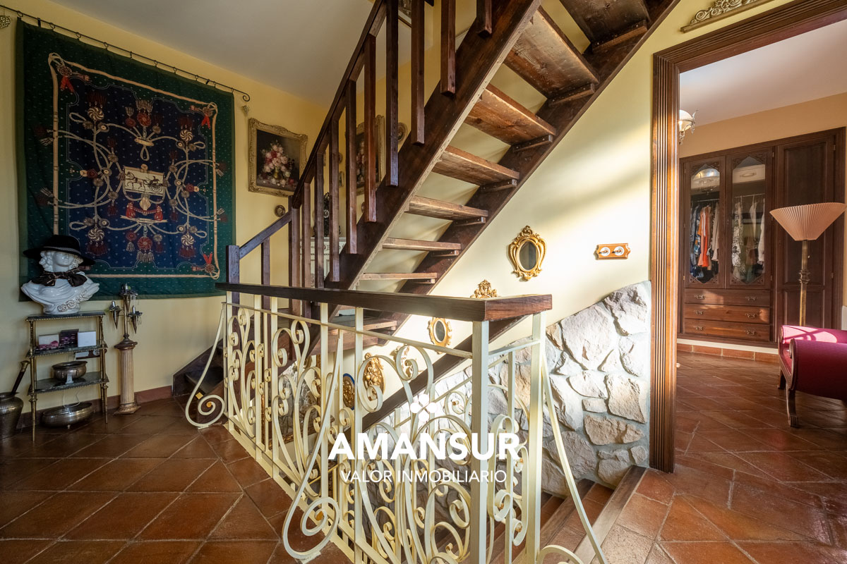 En planta baja, un gran recibidor da paso a un amplio salón con chimenea, zona de comedor y grandes ventanales con salida directa al porche y al jardín, una cocina independiente de gran tamaño equipada con electrodomésticos y zona office, un comedor privado independiente y un dormitorio actualmente utilizado como biblioteca.